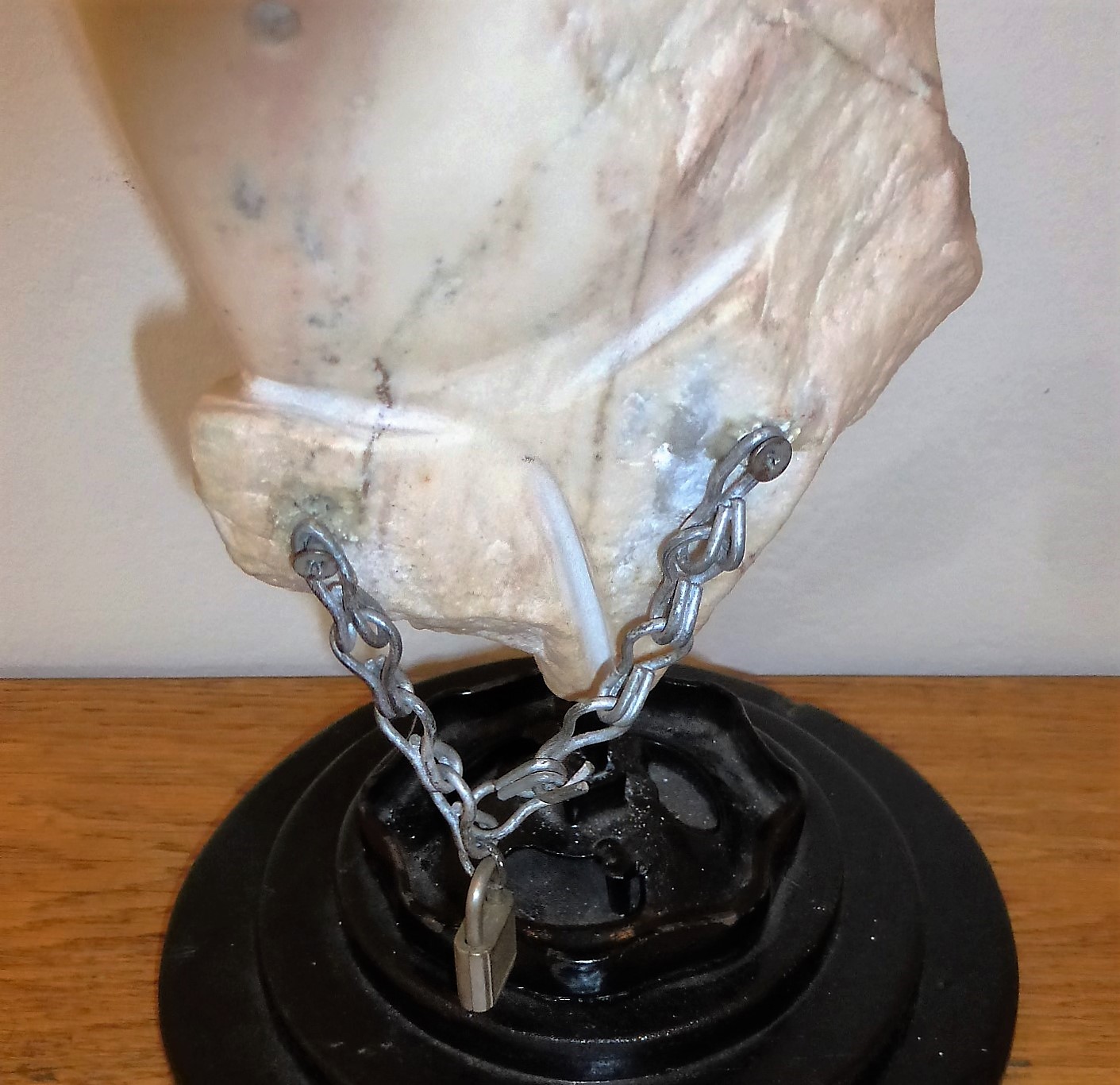 #1 INFIBULATION STONE by Alloysius Osagie. Marble and metal. 1998. Bio: Born in 1965, Mr Osagie graduated from Auchi Polytechnic and in 1994 earned the Higher National Diploma (H.N.D.) in sculpture. He specializes in stone carving and junk sculpture, has taken part in numerous exhibitions, and provided still another statue called BLADE AND SHELL for the original Lagos exhibition. Both the razor and the shell suspended above the head of a sculpted mother and child depict specific tools actually deployed for cutting in Nigeria. About the work: FORWARD – Germany’s executive committee, consisting equally of African and European members, chose “Infibulation Stone” for the cover of the first German exhibition catalogue in 1998, the sculpture thought most appropriate for its colour and evocation of a European ‘tradition’ whose remnant can be seen in official Museums of Torture, namely the ‘chastity belt’. Aware of the need to address racism when addressing FGM in any European context, the whiteness of the stone highlighted gender as a concept while muting race. Classified by WHO as type 3 FGM, infibulation is the most severe form of genital assault and makes sense only in a context of sexual inequality. It is practiced by certain minorities in Nigeria.