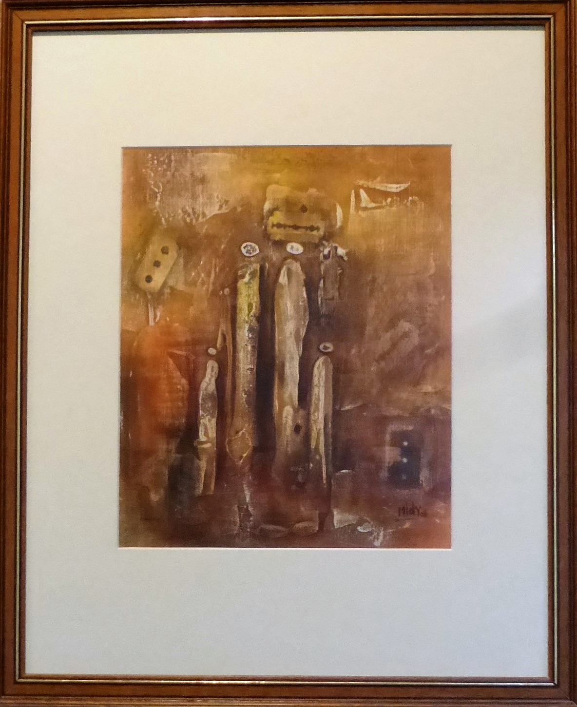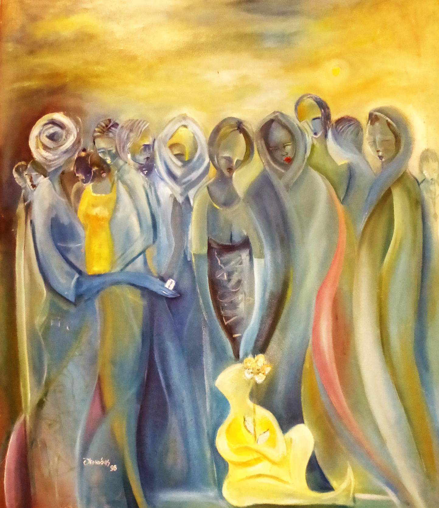 #3 DEFIANCE 2 by Godfrey Williams-Okorodus. Oil on Canvas. 1998. Bio. See above. About the work: Her back turned to the village, a young woman with a questioning expression folds her arms across her chest, digging in. Hoping to break with tradition, to preserve the luscious, fat flower to her left, she finds the way forward blocked by imams to her right, ethereal figures that appear not only in front but also behind her. In the foreground, faded roses presage the worst, the youth’s defiance notwithstanding when the individual challenges the group.