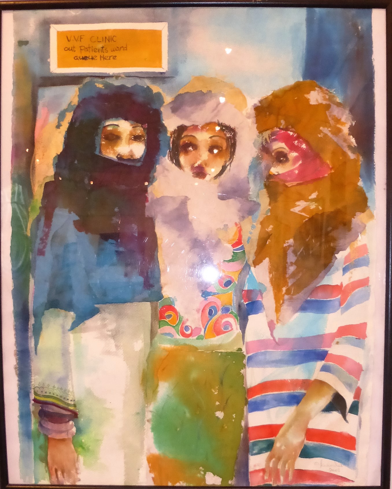 #6 THE QUEUE by Godfrey Williams-Okorodus. Water colour. 1998. Bio: See above. About the work: In Northern Nigeria, the clearly Muslim patients wait for treatment for vesico-vaginal fistula, VVF, which some believe is more likely to occur in young victims of FGM. Incontinence follows on the death of tissue between the vagina and the rectum or urethra and, although in many (though not all) cases repair is relatively simple, most sufferers lack sufficient funds. VVF is one of the most horrendous sequelae of excision.