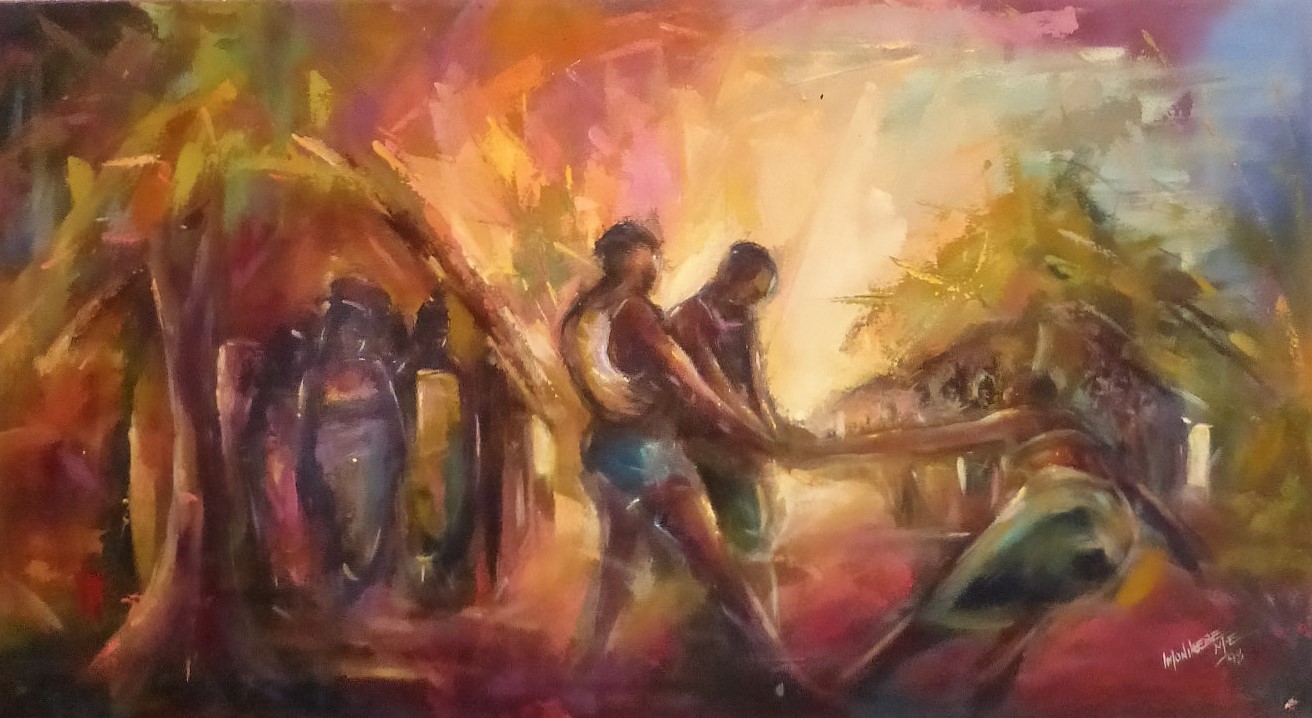#11 BLADES by Godfrey Williams-Okorodus. Oil on canvas. 2000. Bio: See above. About the work: Complicit in the practice as the blades cascade, the generations stand in solidarity, either all to be cut or all spared. The pivotal moment shows in the children’s expectant postures and the mothers’ noncommittal gaze.