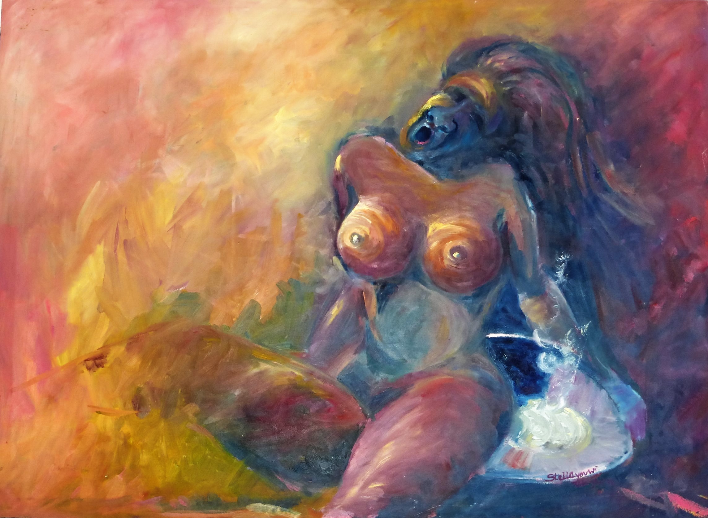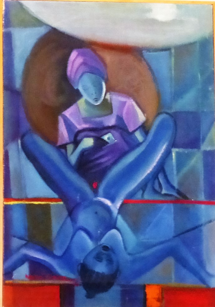 #16 AGONY – AN EXPERIENCE I WILL NEVER FORGET by Stella Ubigho. Oil on canvas. 1998. Bio: Born in 1969, a painter and graphic artist, Ms Ubigho earned a High National Diploma (H.N.D.) in painting at Auchi Polytechnic and has been represented in many group exhibitions in Nigeria. She works mainly in water colours, pastels, and oil. About the work: Autobiographical, the victim universalizes excruciating pain by adapting Edvard Munch’s Der Schrei (The Scream), superimposing the familiar European symbol of distress onto the mature form of an African woman. Note the emphasis on the well-formed breasts, youthful and attractive. The face in contrast is markedly aged.