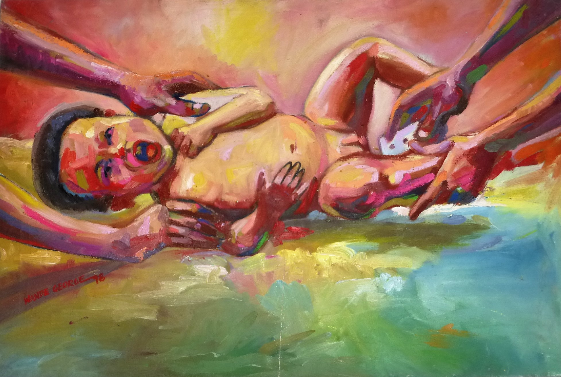 #17 BARBARIC ACT by Wande George. Oil on canvas. 1998. Bio: Born in 1962, Mr George earned the N.H.D. at Auchi Polytechnic in painting and illustration and has been employed as an illustrator at Lintas, Nigeria’s best-known advertising agency. He has participated in several group exhibitions. About the work: In Nigeria, specific groups fear that should an infant’s head touch the clitoris, the child will die. Clitoridectomy is thus imposed during childbirth.